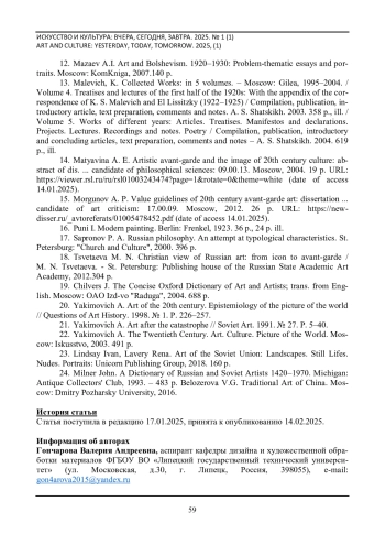 14. Матявина А.Е. Художественный авангард и образ культуры XX века: автореферат дис.. канд. филос. наук: 09.00.13. Москва, 2004. 19 с. URL: https://viewer.rsl.ru/ru/rsl01003243474?page=1&rotate=0&theme=white (дата обращения 14.01.2025 г.).