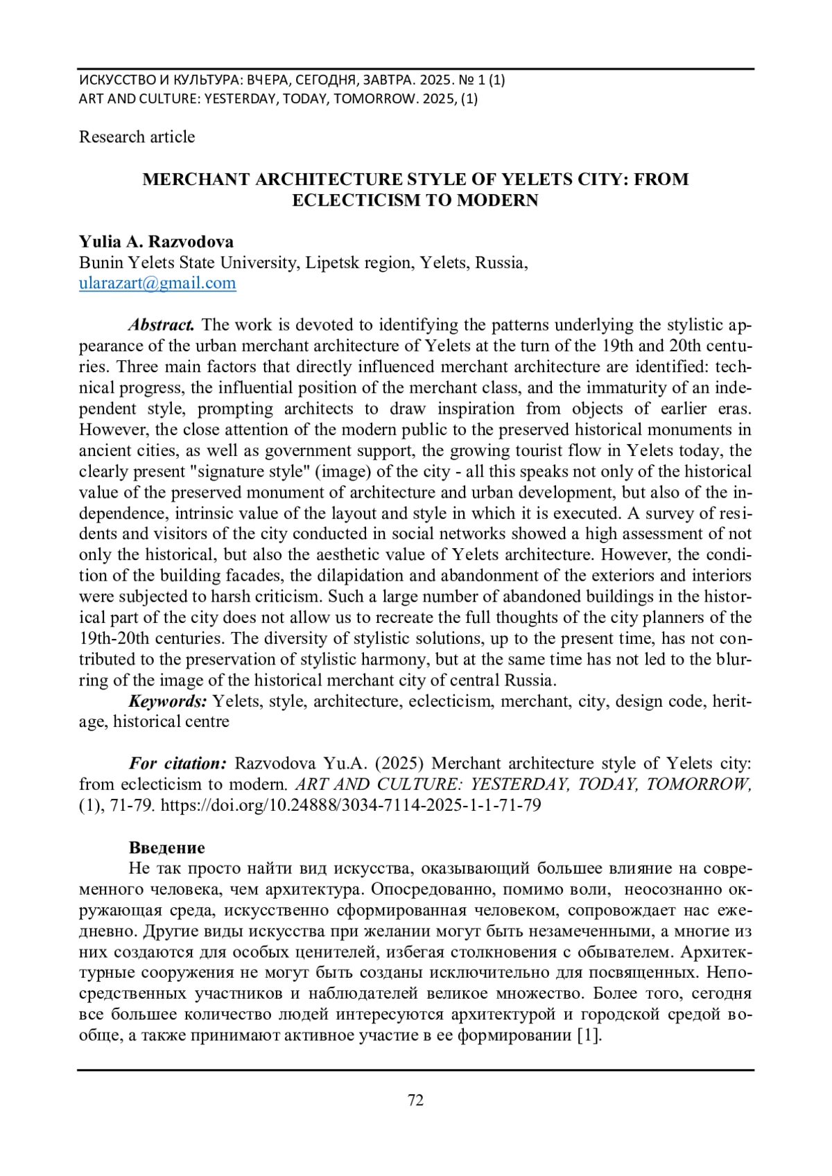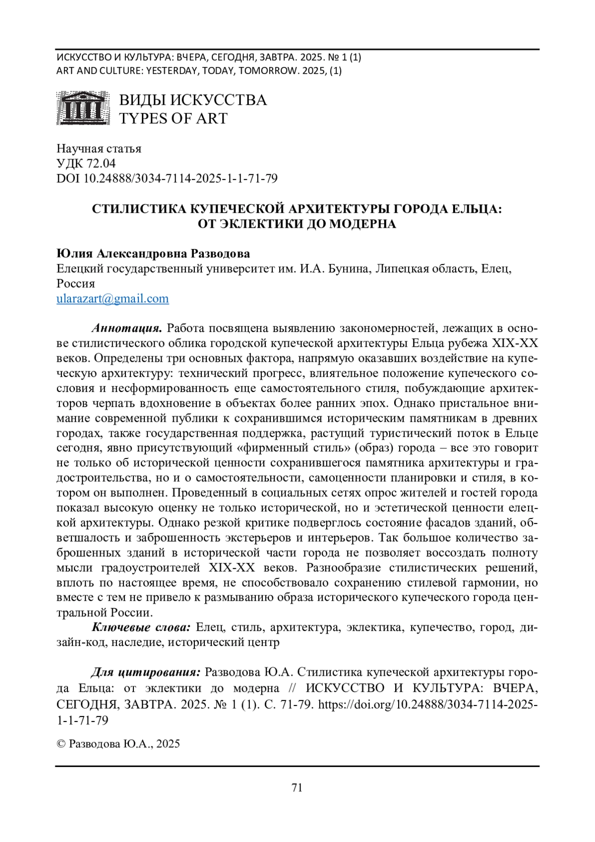 Работа посвящена выявлению закономерностей, лежащих в основе стилистического облика городской купеческой архитектуры Ельца рубежа XIX-XX веков. Определены три основных фактора, напрямую оказавших воздействие на купеческую архитектуру: технический прогресс, влиятельное положение купеческого сословия и несформированность еще самостоятельного стиля, побуждающие архитекторов черпать вдохновение в объектах более ранних эпох. Однако пристальное внимание современной публики к сохранившимся историческим памятникам в древних городах, также государственная поддержка, растущий туристический поток в Ельце сегодня, явно присутствующий «фирменный стиль» (образ) города - все это говорит не только об исторической ценности сохранившегося памятника архитектуры и градостроительства, но и о самостоятельности, самоценности планировки и стиля, в котором он выполнен. Проведенный в социальных сетях опрос жителей и гостей города показал высокую оценку не только исторической, но и эстетической ценности елецкой архитектуры. Однако резкой критике подверглось состояние фасадов зданий, обветшалость и заброшенность экстерьеров и интерьеров. Так большое количество заброшенных зданий в исторической части города не позволяет воссоздать полноту мысли градоустроителей XIX-XX веков. Разнообразие стилистических решений, вплоть по настоящее время, не способствовало сохранению стилевой гармонии, но вместе с тем не привело к размыванию образа исторического купеческого города центральной России.