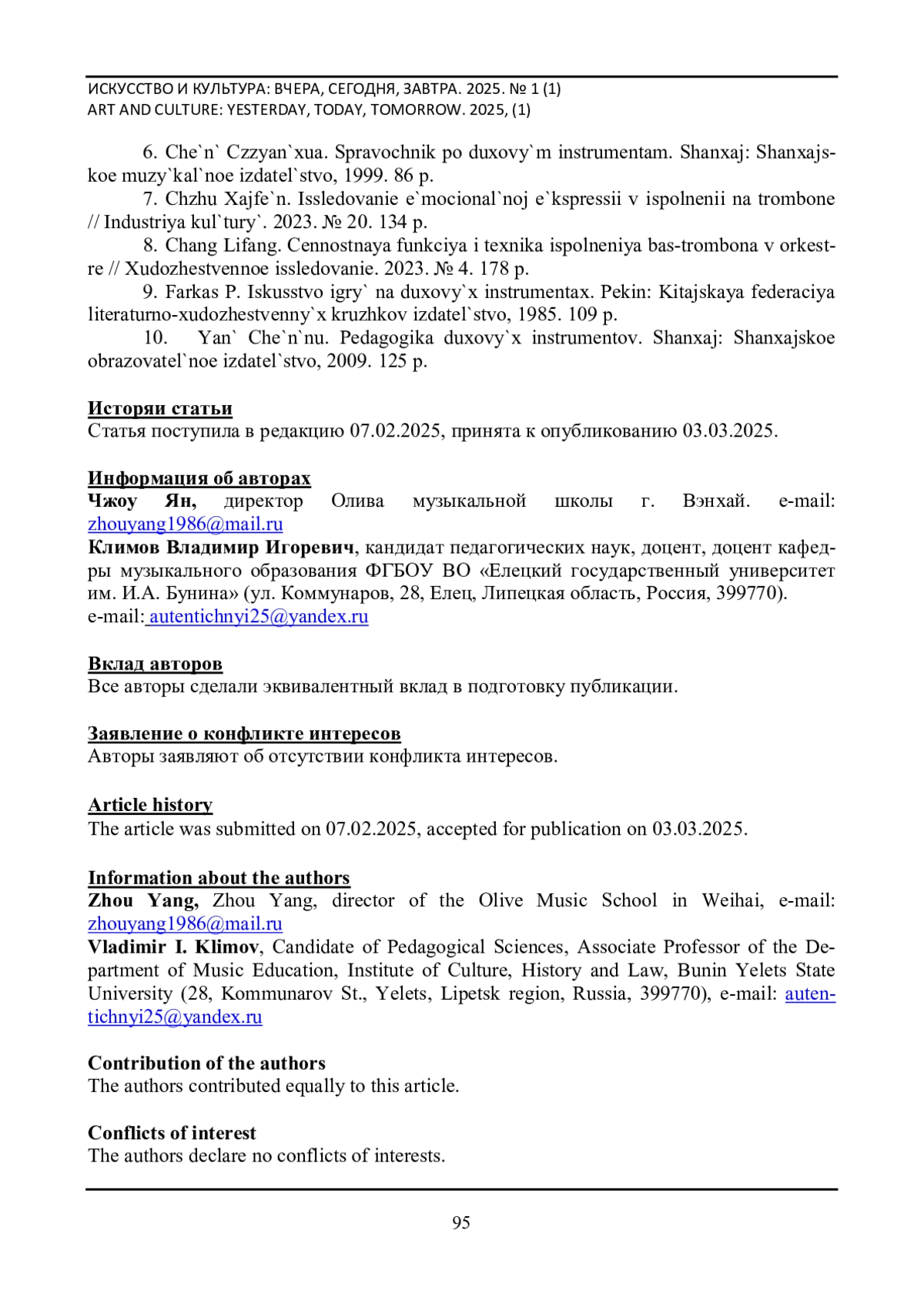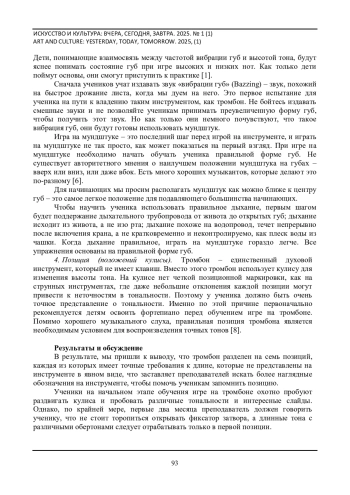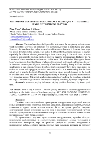 ЧЖОУ Я., КЛИМОВ В. И. МЕТОДЫ РАЗВИТИЯ ИСПОЛНИТЕЛЬСКОЙ ТЕХНИКИ НА НАЧАЛЬНОМ ЭТАПЕ ИГРЫ НА ТРОМБОНЕ // ИСКУССТВО И КУЛЬТУРА: ВЧЕРА, СЕГОДНЯ, ЗАВТРА. 2025. № 1 (1)