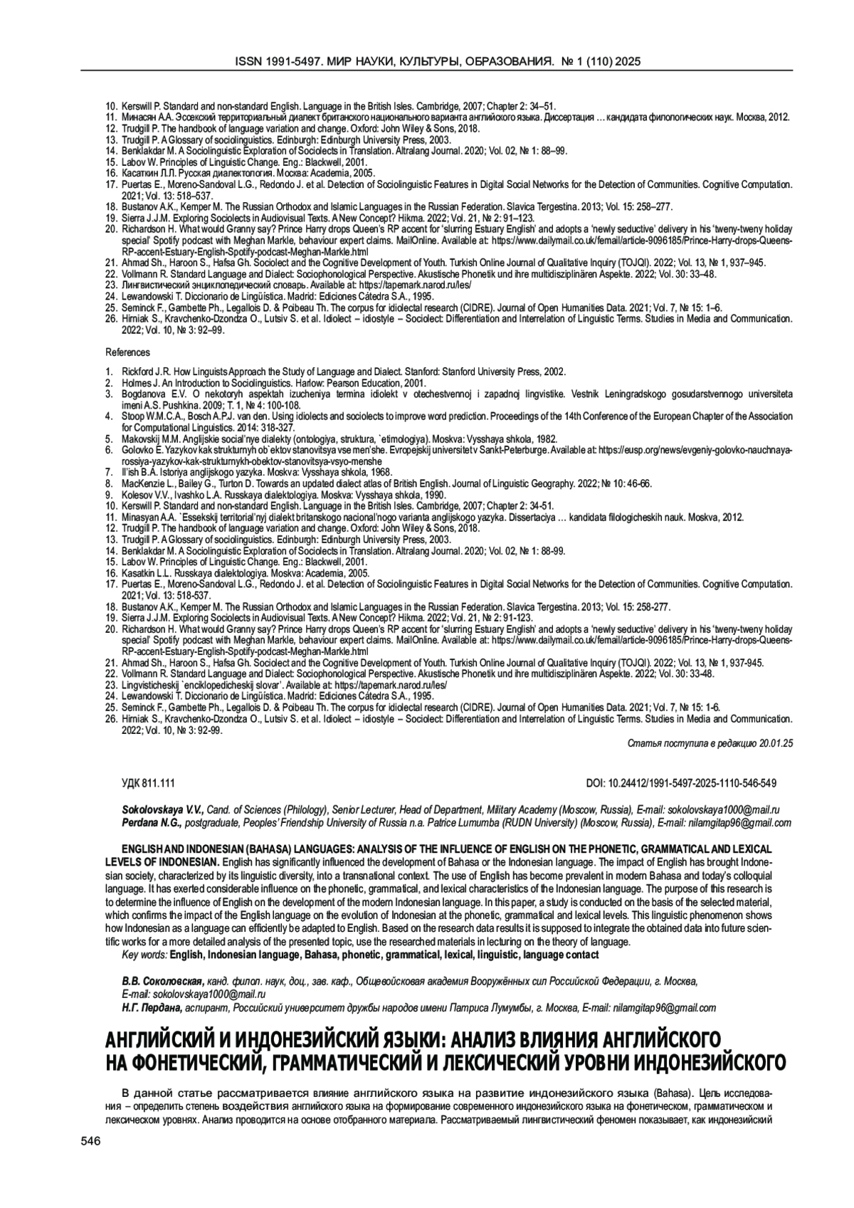 В данной статье рассматривается влияние английского языка на развитие индонезийского языка (Bahasa). Цель исследова ния – определить степень воздействия английского языка на формирование современного индонезийского языка на фонетическом, грамматическом и лексическом уровнях. Анализ проводится на основе отобранного материала. Рассматриваемый лингвистический феномен показывает, как индонезийский язык может быть эффективно адаптирован к английскому. Использование английского стало преобладающим в современном языке Bahasa, что придает индонезийскому обществу, характеризующимся языковым разнообразием, транснациональный контекст. По результатам исследования предполагается интегрировать полученные данные в будущие научные работы для более детального анализа представленной темы, использовать исследованные материалы при чтении лекций по теории язык.