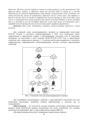 В условиях глобальных изменений в структуре итоговой аттестации обучающихся СПО становится актуальным вопрос в формировании навыков работы с программным обеспечением для сдачи демонстрационного экзамена по своему профилю направления. В данной статье рассматривается проектирование, практическая доработка и моделирование на базе гипервизора VirtualBox топология сети из демонстрационного экзамена по направлению подготовки 09.02.06 в 2025 году. Приводится текущая топология и предлагается упрощение ее составляющих путем удаления узлов HQ-SW, SRV-Net и CLI-Net, при этом сохраняя функциональность оригинальной схемы при существенном снижении сложности для обучающихся. Оптимизированная версия сети послужила базой бля моделирования на базе гипервизора VirtualBox. Так же продемонстрирована настройка основных сетевых параметров на роутерах в виртуальных машинах. Данный подход позволяет обучающимся обеспечить эффективное освоение практических навыков настройки сетевой инфраструктуры для практической реализации при сдаче демонстрационного экзамена. Кроме этого, в статье приводится понятие виртуализации, гипервизора и его различных типов. Ставится акцент на то, что реализовать топологию сети в рамках сдачи демоэкзамена можно только в хост-система виртуализации первого типа. Исходя из полученные данных можно сделать вывод о целесообразности использования гипервизора VirtualBox как основное средство виртуализации и упрощенной топологии сети, не утратившей функционально значимых зависимостей.