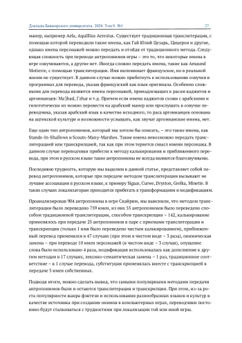Данная статья посвящена исследованию способов перевода антропонимов в текстах игровой и компьютерной направленности и сложностей, с которыми сталкиваются переводчики. Целью исследования является анализ методов перевода антропонимов при локализации игры «Скайрим», а также обобщение данных о приемах, которые были использованы при переводе имен собственных. В статье упоминаются методы, которые тоже могут применяться при локализации, но не имеют особой популярности. Всего было проанализировано 904 антропонима. Сфера применяемости результатов - обучающие пособия по практике перевода и локализации игр.