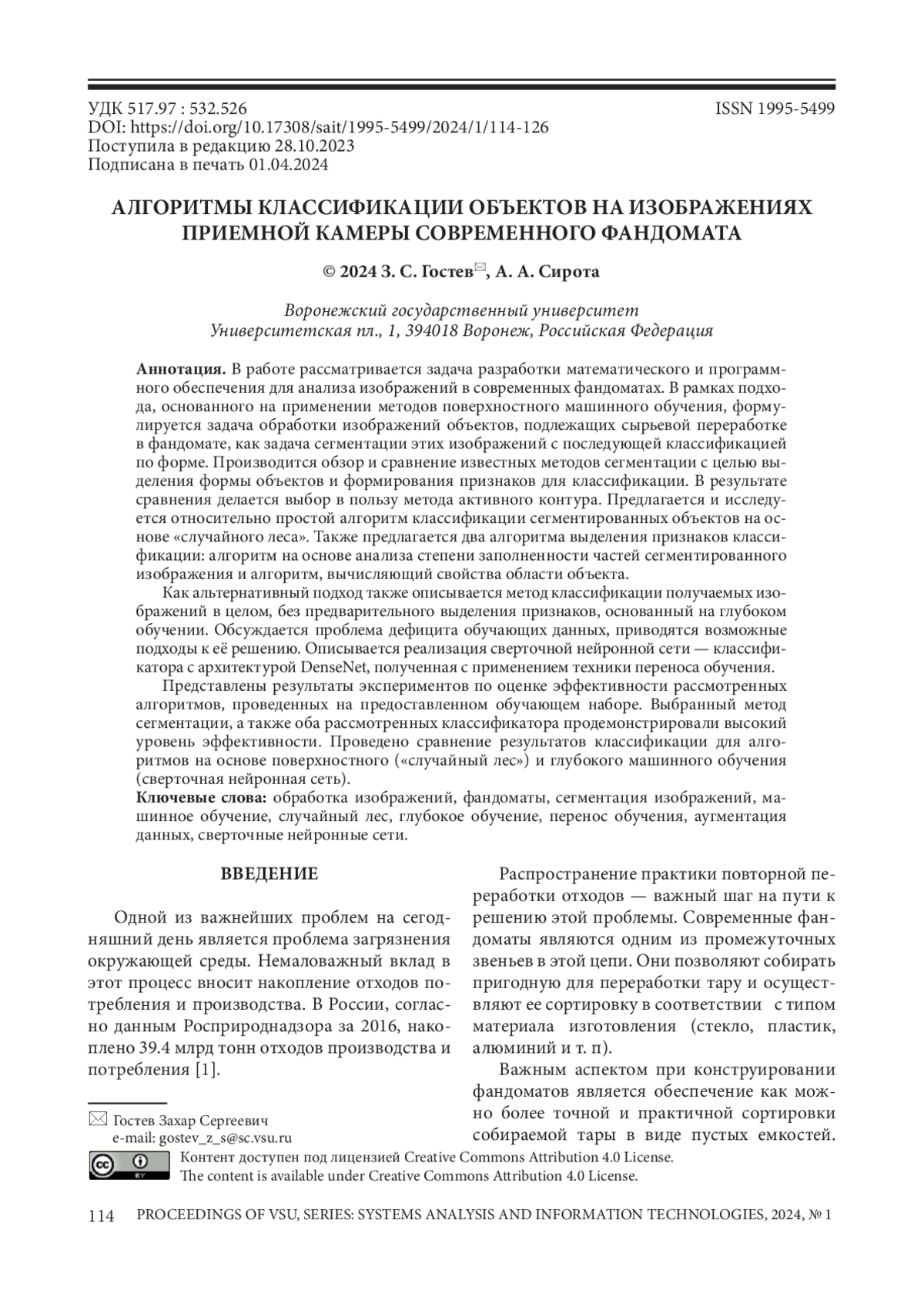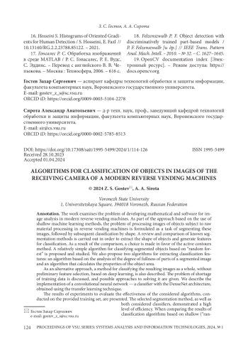 ГОСТЕВ З. С., СИРОТА А. А. АЛГОРИТМЫ КЛАССИФИКАЦИИ ОБЪЕКТОВ НА ИЗОБРАЖЕНИЯХ ПРИЕМНОЙ КАМЕРЫ СОВРЕМЕННОГО ФАНДОМАТА // ВЕСТНИК ВОРОНЕЖСКОГО ГОСУДАРСТВЕННОГО УНИВЕРСИТЕТА. СЕРИЯ: СИСТЕМНЫЙ АНАЛИЗ И ИНФОРМАЦИОННЫЕ ТЕХНОЛОГИИ. 2024. № 1