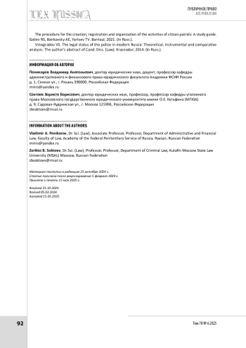 18. Слепнёв Е. А. Развитие организационно-правовых форм взаимодействия советской милиции с органами общественной самодеятельности по охране общественного порядка (по материалам РСФСР) : автореф. дис. … канд. юрид. наук. М., 1992.