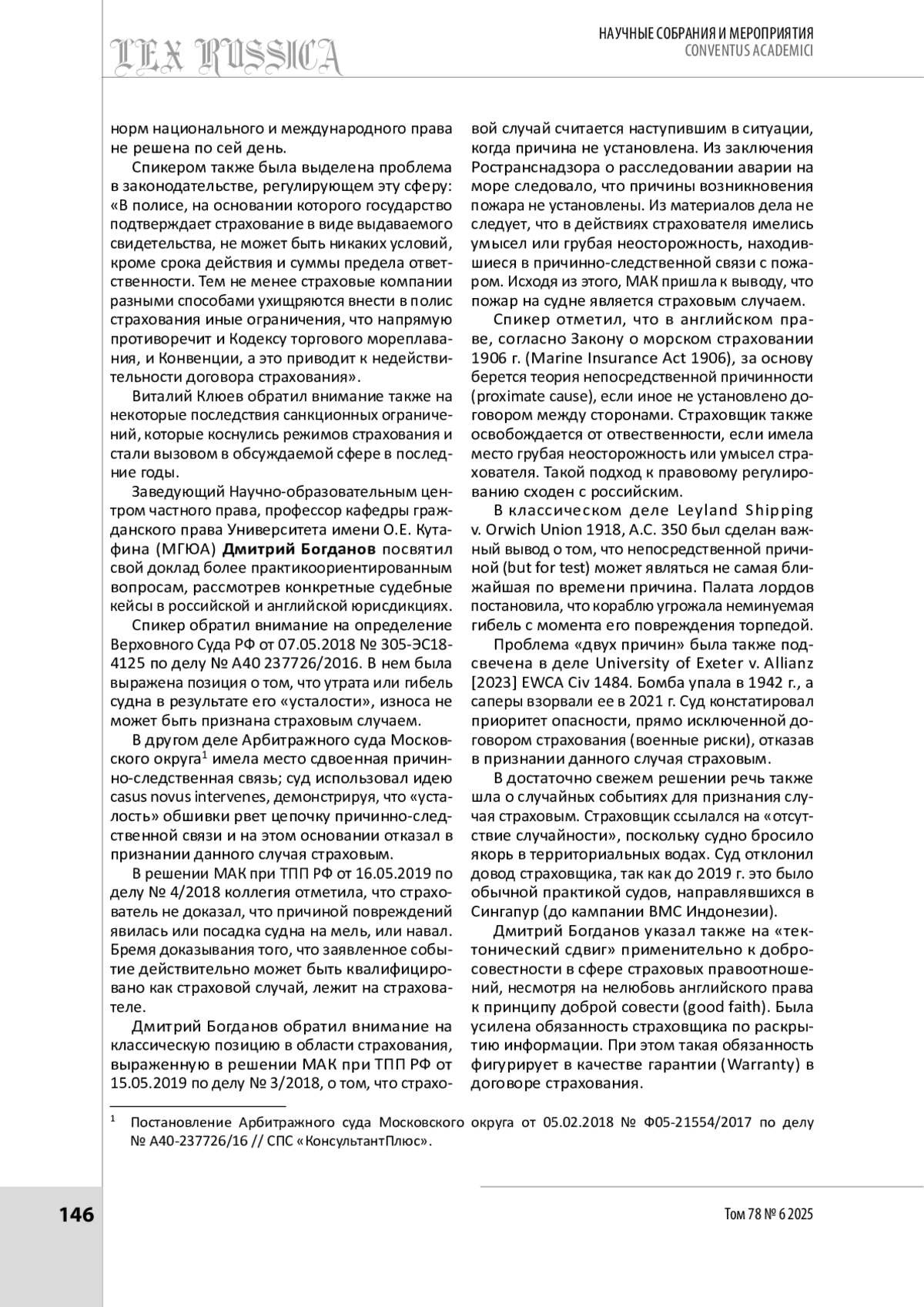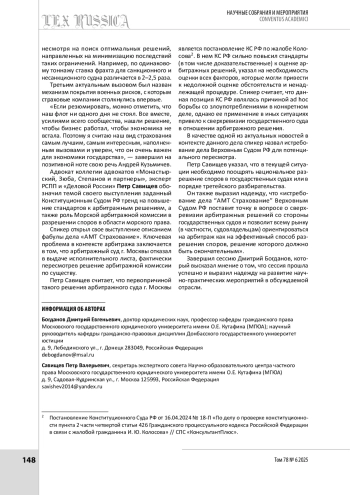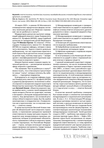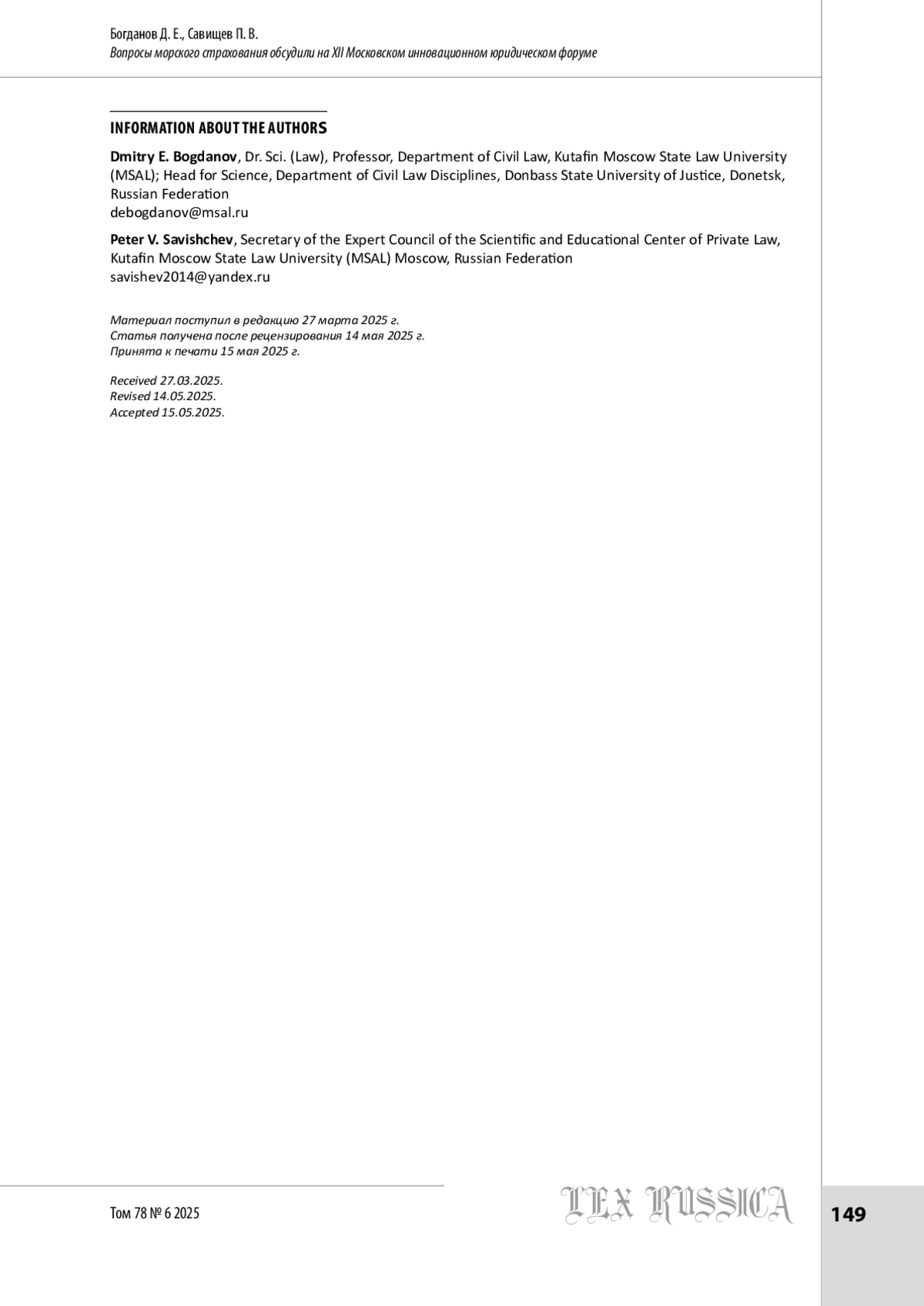 САВИЩЕВ П. В., БОГДАНОВ Д. Е. ВОПРОСЫ МОРСКОГО СТРАХОВАНИЯ ОБСУДИЛИ НА XII МОСКОВСКОМ ИННОВАЦИОННОМ ЮРИДИЧЕСКОМ ФОРУМЕ // LEX RUSSICA (РУССКИЙ ЗАКОН). 2025. ТОМ 78, № 6