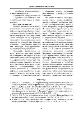 4. Жуковская И. Е. Цифровые платформы - важный аспект цифровизации высшего образования // Открытое образование. 2022. Т. 26. № 4. С. 30 - 40.