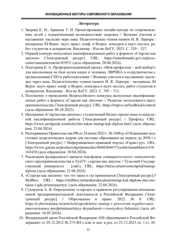 1. Зверева Е. И., Аравина Т. И. Проектирование онлайн-центра по сопровождению детей с ограниченными возможностями здоровья // Великие учителя и наставники: наследие через века. Педагогические чтения памяти И. Я. Лернера : материалы XI Всрос. науч.-практ. конф. и Всерос. конкурса и науч.-исслед. работ студентов и аспирантов. Владимир : Изд-во ВлГУ, 2023. С. 320 - 327.