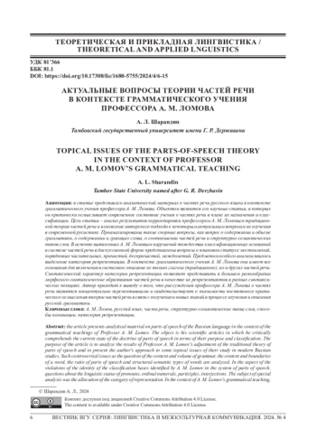 В статье представлен аналитический материал о частях речи русского языка в контексте грамматического учения профессора А. М. Ломова. Объектом являются его научные статьи, в которых он критически осмысливает современное состояние учения о частях речи в плане их назначения и классификации. Цель статьи - анализ результатов корректировки профессором А. М. Ломовым традиционной теории частей речи и изложение авторского подхода к некоторым актуальным вопросам их изучения в современной русистике. Проанализированы такие спорные вопросы, как вопрос о содержании и объеме грамматики, о содержании и границах слова, о соотношении частей речи и структурно-семантических типов слов. В аспекте выявленных А. М. Ломовым нарушений тождества классификационных оснований в системе частей речи в дискуссионной форме представлены вопросы о языковом статусе местоимений, порядковых числительных, причастий, деепричастий, междометий. Предметом особого анализа явилось выделение категория репрезентации. В контексте грамматического учения А. М. Ломова она имеет все основания для включения в системное описание не только глагола (традиционно), но и других частей речи. Синтаксический характер категории репрезентации позволяет представить в большем разнообразии морфолого-синтаксические образования частей речи в качестве их репрезентантов в разных синтаксических позициях. Автор приходит к выводу о том, что рассуждения профессора А. М. Ломова о частях речи являются концептуально перспективными и свидетельствуют о значимости постоянного критического осмысления теории частей речи в связи с получением новых знаний в процессе изучения и описания русской грамматики.