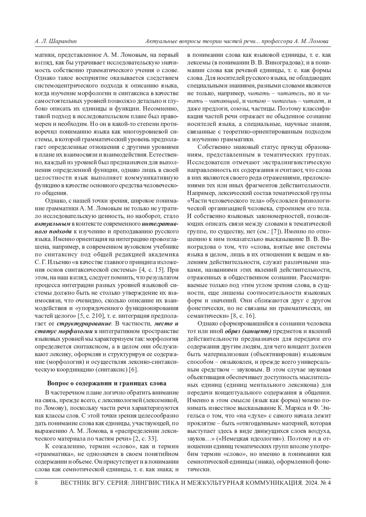 9. Шарандин А. Л. Учение В. В. Виноградова о структурно-семантических типах слов: методологический характер и перспективы его реализации в русистике // Горизонты современной русистики. М.: ГИРЯ им. А. С. Пушкина, 2020. С. 695-702.