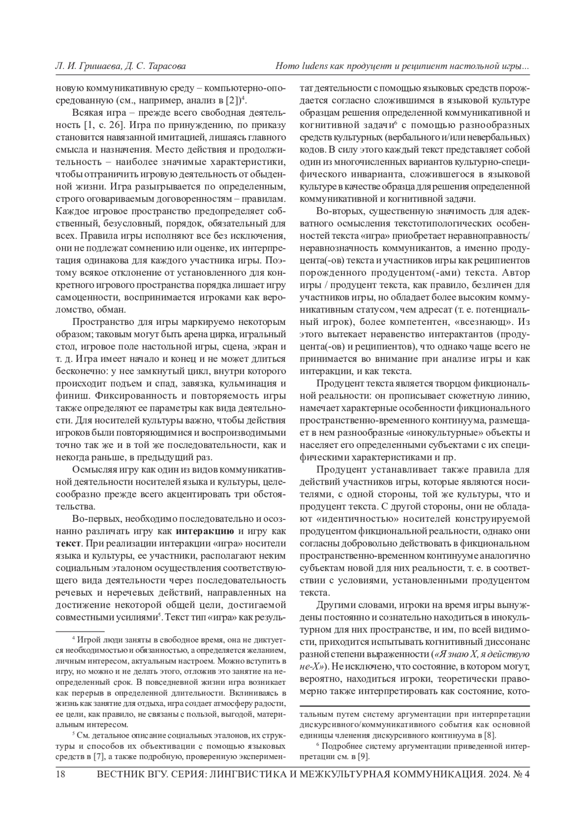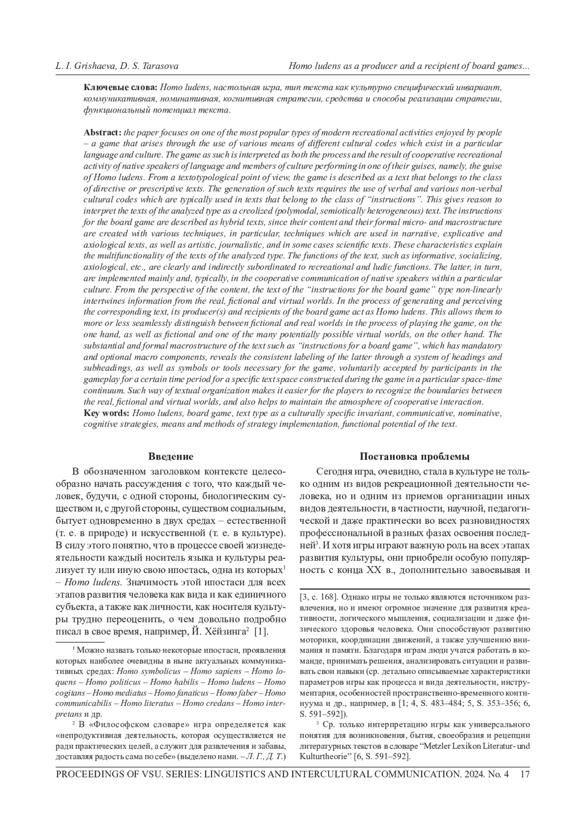 В фокусе рассуждений - продукт одного из наиболее популярных видов рекреационной деятельности современных носителей культуры - игра, возникающая с помощью использования разнообразных средств разных культурных кодов, которыми на определенный момент располагает та или иная языковая культура. Игра как таковая интерпретируется в качестве процесса и результата рекреационной, кооперативной деятельности носителей языка и культуры, выступающих в одной из своих ипостасей - Homo ludens. С текстотипологических позиций игра описывается как текст из класса директивных/прескриптивных, при порождении которого используются средства вербального и нескольких невербальных культурных кодов, как одна из разновидностей текстов из класса «инструкции». Это дает основание трактовать тексты анализируемого типа как креолизованный (полимодальный, семиотически гетерогенный) текст. Инструкция к настольной игре описывается вместе с тем как гибридный текст, поскольку в содержательной и формальной микро- и макроорганизации таких текстов используются различные техники текстопорождения, в частности, текстов нарративных, экспликативных и аксиологических, а также текстов художественных, публицистических, а в ряде случаев и научных. Названные характеристики объясняют полифункциональность текста анализируемого типа, причем функции текста, такие как информативная, социализирующая, аксиологическая и др., явно и опосредованно подчинены рекреационной и людической. Последние в свою очередь реализуются преимущественно и, как правило, в кооперативном общении носителей языка и культуры. Содержательно в тексте «инструкция к настольной игре» нелинейно сочленяются сведения из реального, фикционального и виртуального миров. Продуцент(ы) и реципиенты настольной игры в процессе порождения и восприятия соответствующего текста выступают в одной из своих многочисленных ипостасей - как Homo ludens. Это позволяет им более или менее определенно и более или менее беспроблемно разграничивать в процессе самой игровой деятельности фикциональный и реальный миры, с одной стороны, а также фикциональный и один из множества потенциально возможных виртуальных миров - с другой. Содержательная и формальная макроструктура текста типа «инструкция к настольной игре», располагающая обязательными и факультативными макрокомпонентами, обнаруживает последовательную маркировку последних через систему заголовков и подзаголовков, а также символов и/или условных обозначений либо необходимого для игры инструментария, добровольно принимаемых участниками игрового процесса на определенный временной отрезок для конкретного текстового пространства, конструируемого в игровом пространственно-временном континууме. Такой способ текстовой организации облегчает участникам игры распознавание границ между реальным, фикциональным и виртуальным мирами, а также способствует поддержанию атмосферы кооперативного взаимодействия.