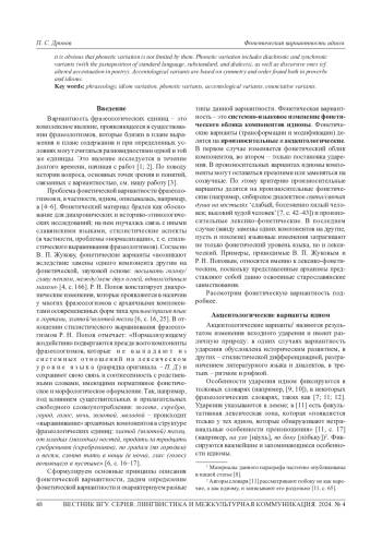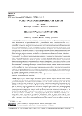 ДРОНОВ П. С. ФОНЕТИЧЕСКАЯ ВАРИАНТНОСТЬ ИДИОМ // ВЕСТНИК ВОРОНЕЖСКОГО ГОСУДАРСТВЕННОГО УНИВЕРСИТЕТА. СЕРИЯ: ЛИНГВИСТИКА И МЕЖКУЛЬТУРНАЯ КОММУНИКАЦИЯ. 2024. № 4