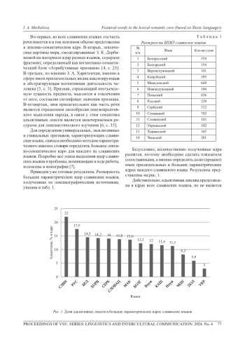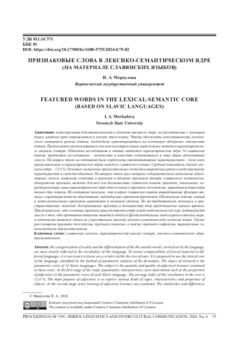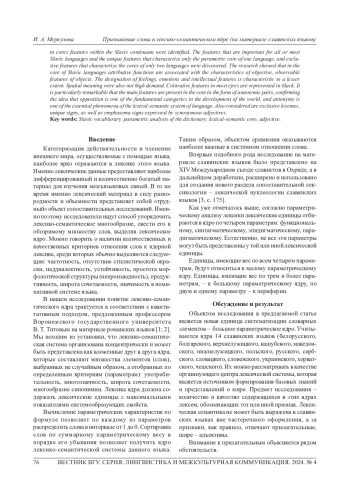 Категоризация действительности и членение внешнего мира, осуществляемые с помощью языка, наиболее ярко отражаются в лексике этого языка. Чтобы обеспечить сопоставимость лексического материала разных языков, необходимо ориентироваться на некоторое обозримое множество единиц. Предлагается воспользоваться лексическим ядром языка, выделенным методом параметрического анализа словаря. Объектом исследования в статье являются параметрические ядра 14 славянских языков, предметом исследования - количество и качество содержащихся в этих ядрах адъективных лексем. На первом этапе исследования были определены квантитативные характеристики - доля имен прилагательных в параметрических ядрах каждого славянского языка. Средний показатель данной лексики в ядре -12,4 %. Основное назначение прилагательных состоит в выражении разного рода признаков, характеристик и свойств объектов. На втором этапе рассмотрено содержательное наполнение адъективных лексем, выявлены сходства и различия в ядерных признаках внутри славянского континуума: обнаружены признаки, важные для всех или большинства славянских языков, признаки, уникальные, характеризующие лишь параметрическое ядро одного языка и признаки-эксклюземы, характеризующие ядра только двух языков. Исследование показало, что в ядрах славянских языков атрибутивные функции связаны с характеристиками объективных, наблюдаемых признаков предметов. Обозначение чувств, эмоций и интеллектуальных признаков характерно в меньшей степени. Не востребованными оказались и пространственные значения. Колоративные признаки в большинстве ядер представлены черным цветом. Примечательно, что основные признаки присутствуют в ядре в виде антонимических пар, подтверждая мысль о том, что противопоставление является одной из фундаментальных категорий в освоении мира, а антонимия является одним из существенных явлений лексико-семантической системы языка. Также рассмотрены признаки-эксклюземы, признаки-уникалии, а также признаки-эмфаземы, выраженные синонимичными прилагательными.
