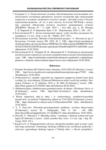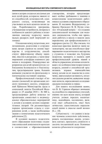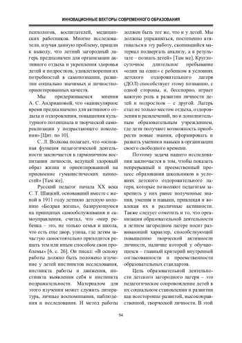 Ключевые фразы: летний загородный лагерь, ПЕДАГОГИЧЕСКАЯ ДЕЯТЕЛЬНОСТЬ, ДЕТИ, ВОЖАТЫЙ, принципы, модели лагерей, СУБЪЕКТНОСТЬ, СОЦИАЛИЗАЦИЯ