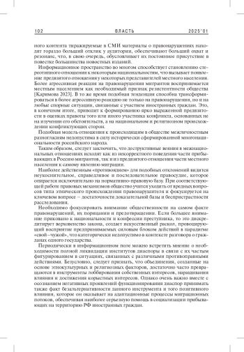 Статья посвящена исследованию межнациональных и межрелигиозных отношений, а также их роли в провоцировании конфликтов. Анализируется важность эффективной национальной политики для обеспечения государственной безопасности, особенно в условиях многонационального и многоконфессионального общества, характерного для России. Рассматриваются ключевые факторы, способствующие возникновению этнических конфликтов, включая когнитивно-психологические катализаторы, такие как нежелание мигрантов интегрироваться в новое общество и предвзятое отношение местного населения к иностранцам. Обсуждается роль диаспор, их положительные и отрицательные аспекты, а также значение справедливого правосудия в урегулировании конфликтов.