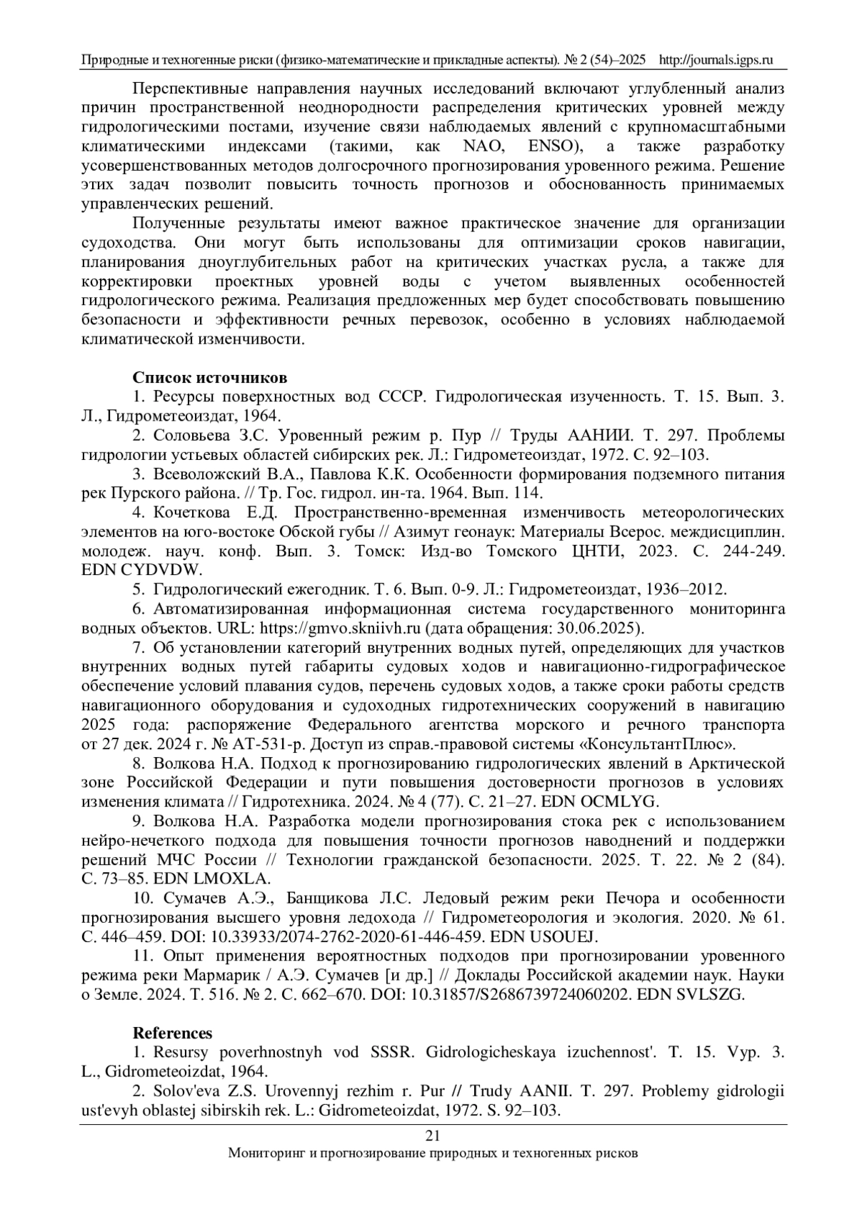 Цель исследования – анализ влияния повышенных уровней воды и выхода реки на пойму на условия судоходства, включая оценку рисков и разработку адаптационных мер. Исследование основано на анализе многолетних гидрологических данных (уровни воды) и их сопоставлении с эксплуатационными параметрами судоходства. Выявлены критические уровни воды по постам на р. Пур, при которых сокращается эффективность навигации из-за затопления знаков и смещения фарватера, скорость течения возрастает, повышая аварийность. Установлена 5–7-летняя цикличность экстремальных паводков, требующая коррекции навигационных графиков. Определены наиболее уязвимые участки (посты Тарко-Сале и Самбург), где выход на пойму приводит к ежегодным экономическим потерям. Исследование показывает необходимость интеграции гидрологического мониторинга и управленческих решений для минимизации рисков в условиях учащения экстремальных подъемов уровня воды арктических рек.