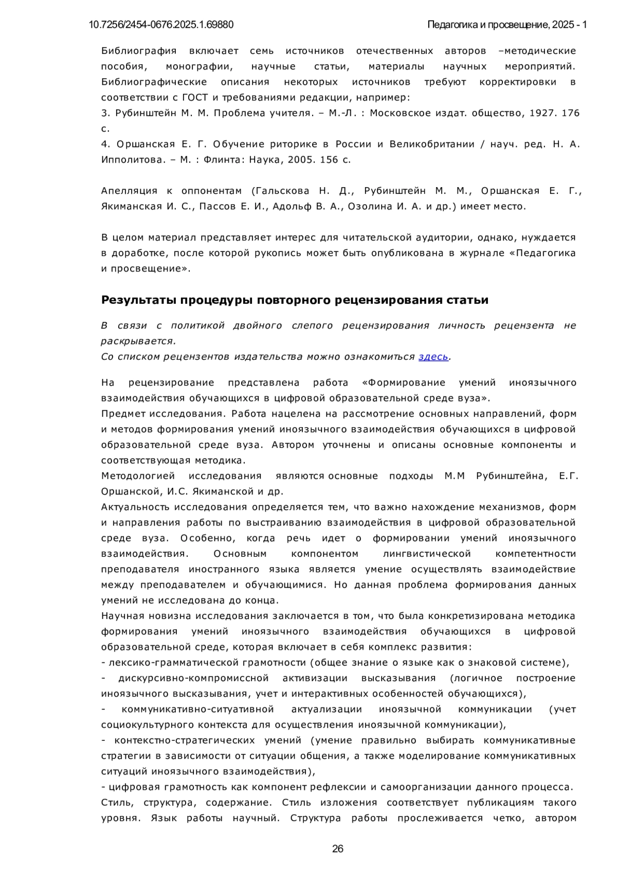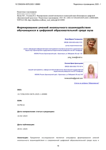 ЯНОВА М. Г., ОЗОЛИНА И. А. ФОРМИРОВАНИЕ УМЕНИЙ ИНОЯЗЫЧНОГО ВЗАИМОДЕЙСТВИЯ ОБУЧАЮЩИХСЯ В ЦИФРОВОЙ ОБРАЗОВАТЕЛЬНОЙ СРЕДЕ ВУЗА // ПЕДАГОГИКА И ПРОСВЕЩЕНИЕ. 2025. № 1