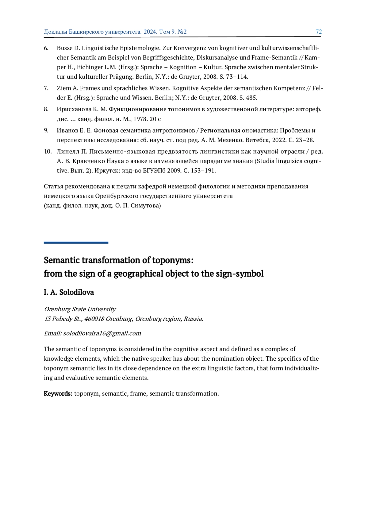 Семантика топонимов рассматривается с точки зрения когнитивного подхода к пониманию языка и определяется широко как совокупность элементов знания, имеющегося у носителей языка об объекте номинации. Специфичность топонимической семантики заключается в ее тесной обусловленности экстралингвистическими факторами, формирующими индивидуализирующие и оценочные признаки.