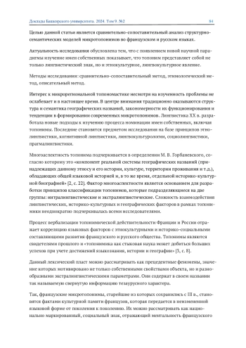 Сравнение микротопонимики французской и русской деревни представляет интерес для исследования структуры топонимической номинации и ее смыслового наполнения. Новые направления в исследовании имен собственных расширили не только семантику французских и русских микротопонимов, но и определили их словообразовательные модели, в которых можно выделить как общие, так и индивидуальные языковые характеристики. Общими чертами для структурных моделей французских и русских микротопонимов являются: прямой переход нарицательного слова в топоним, аффиксальный способ образования, словосложение и словосочетание.
