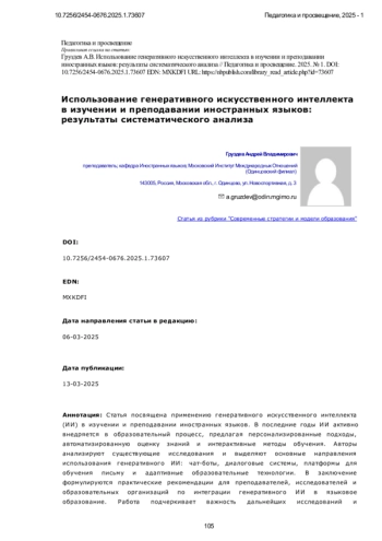 ГРУЗДЕВ А. В. ИСПОЛЬЗОВАНИЕ ГЕНЕРАТИВНОГО ИСКУССТВЕННОГО ИНТЕЛЛЕКТА В ИЗУЧЕНИИ И ПРЕПОДАВАНИИ ИНОСТРАННЫХ ЯЗЫКОВ: РЕЗУЛЬТАТЫ СИСТЕМАТИЧЕСКОГО АНАЛИЗА // ПЕДАГОГИКА И ПРОСВЕЩЕНИЕ. 2025. № 1