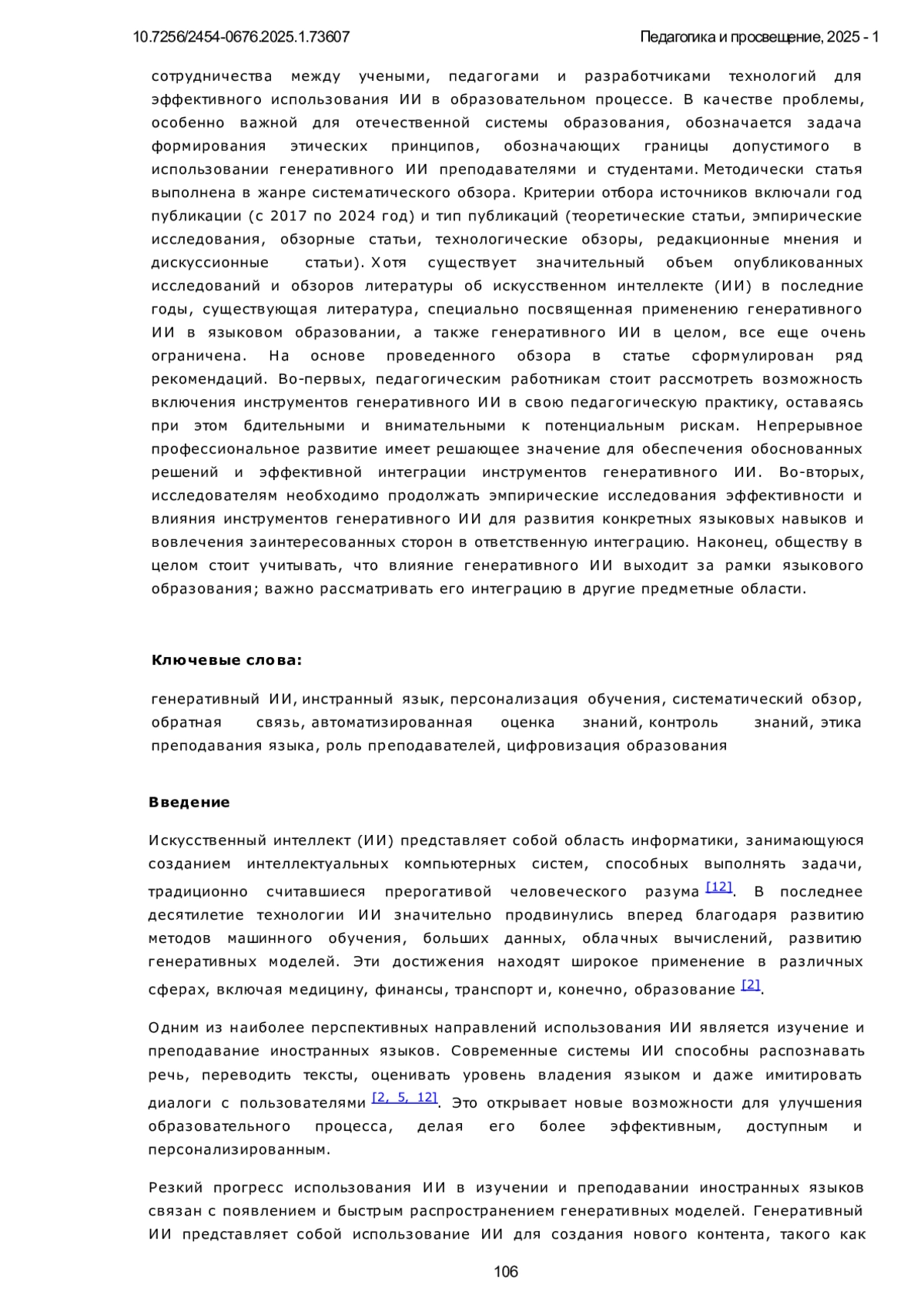 Ключевые фразы: генеративный ии, инстранный язык, персонализация обучения, систематический обзор, обратная связь, автоматизированная оценка знаний, контроль знаний, этика преподавания языка, роль преподавателей, ЦИФРОВИЗАЦИЯ ОБРАЗОВАНИЯ