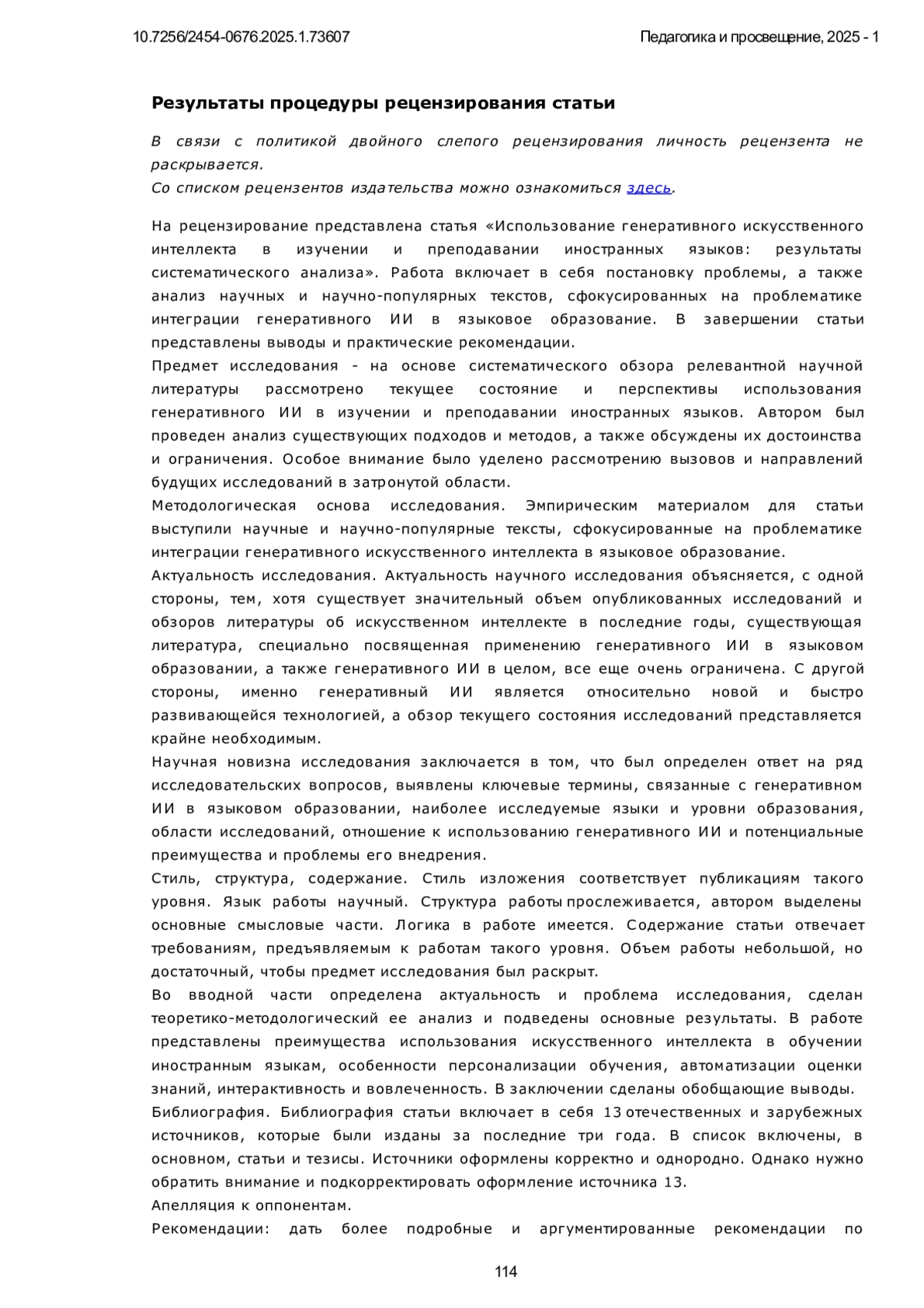 Статья: Использование генеративного искусственного интеллекта в изучении и преподавании иностранных языков: результаты систематического анализа (2025)