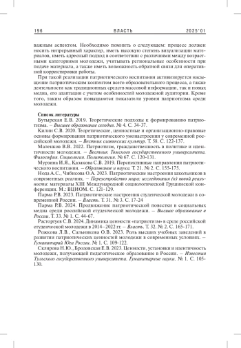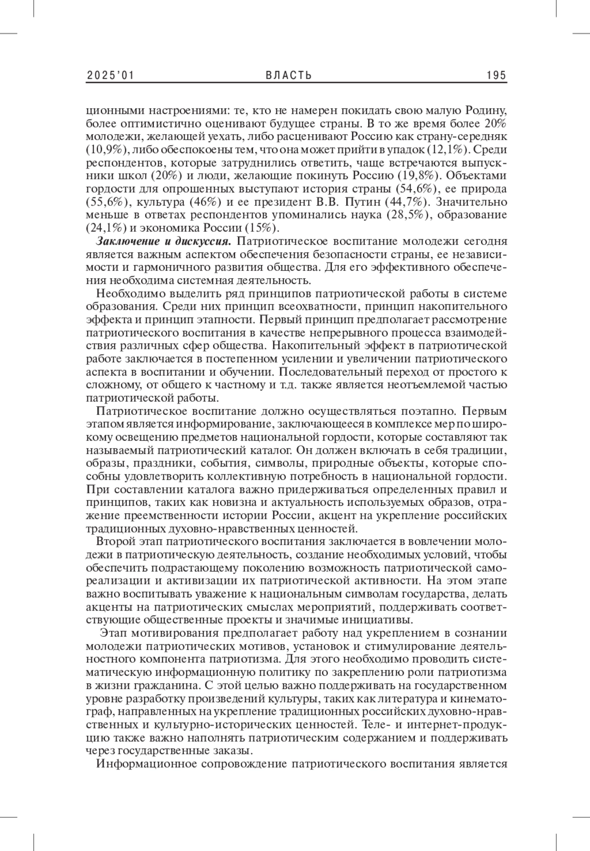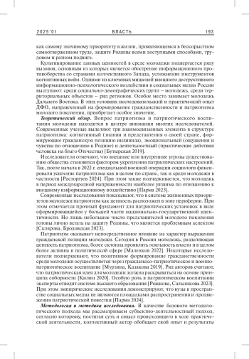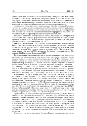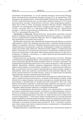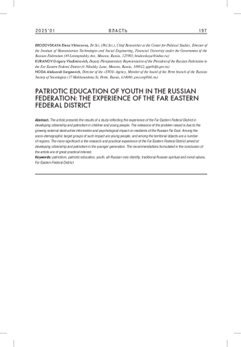БРОДОВСКАЯ Е. В., КУРАНОВ Г. В., НОДА А. С. ПАТРИОТИЧЕСКОЕ ВОСПИТАНИЕ МОЛОДЕЖИ В РОССИЙСКОЙ ФЕДЕРАЦИИ: ОПЫТ ДАЛЬНЕВОСТОЧНОГО ФЕДЕРАЛЬНОГО ОКРУГА // ВЛАСТЬ. 2025. ТОМ 33 № 1