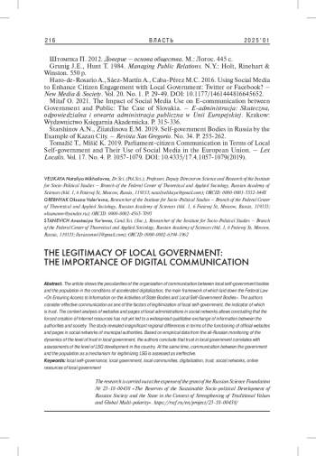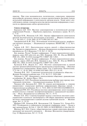 1. Бардаков А.И. 2023. Местное самоуправление в политической системе современной России. - Парадигмы управления, экономики и права. № 1(7). С. 7-18. EDN: WITJDB