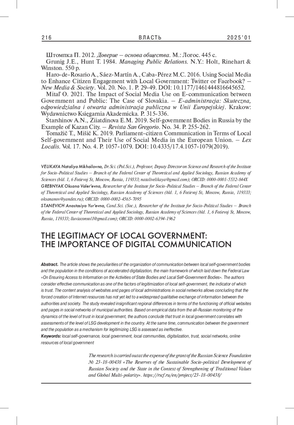 В статье показаны особенности организации коммуникации органов местного самоуправления и населения в условиях ускоренной цифровизации, основные рамки которой были заложены в федеральном законе «Об обеспечении доступа к информации о деятельности государственных органов и органов местного самоуправления». Авторы рассматривают эффективную коммуникацию как один из факторов легитимации местного самоуправления, показателем которого выступает доверие. Контент-анализ сайтов и страниц местных администраций в социальных сетях позволил сделать вывод, что форсированное создание интернет-ресурсов пока не привело к повсеместному качественному обмену информацией между властью и обществом. Исследование выявило несущественные региональные различия в плане функционирования официальных сайтов и страниц в социальных сетях муниципальных органов власти. Опираясь на эмпирические данные всероссийского мониторинга о динамике уровня доверия к местной власти, авторы делают вывод, что доверие к местной власти коррелирует с оценками уровня развития МСУ в стране. При этом коммуникация между властью и населением как механизм легитимации МСУ оценивается как низкоэффективная.