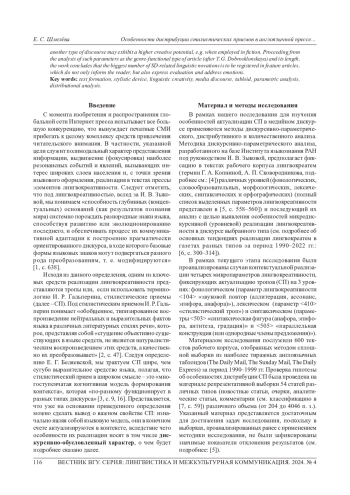 Данная работа посвящена актуальным вопросам текстоформирования в дискурсе разных типов и направлена на выявление общих тенденций реализации стилистических приемов (СП) в текстах медиа. Исследование указанной проблематики осуществлено с применением методик дискурсивно-параметрического, количественного и дистрибутивного анализа. Материалом для анализа послужила репрезентативная выборка статей из тиражных англоязычных таблоидов 1990-1999 гг., что в дальнейшем позволит рассмотреть явление в диахронической перспективе. В результате анализа сделан вывод об активности реализации СП в текстах популярной англоязычной прессы, при этом число лексических СП, по нашим данным, значительно превысило количество установленных случаев активации синтаксических СП. Также было сделано наблюдение о градуальном характере реализации лингвокреативного потенциала наиболее частотных СП (а именно метафоры, метонимии и эпитета), вследствие чего контекстуальные актуализации данныхСП в дискурсе медиа могут оцениваться как мало-, высоко- и антикреативные. Антикреативными мы считаем такие лингвокреатемы, которые обладают сниженным креативным потенциалом в дискурсе выбранного типа, но при этом их креативный потенциал может существенно возрастать при реализации в дискурсах других типов, например, в художественном. Анализ зависимости дистрибуции СП от таких показателей, как функционально-жанровый тип статьи (по Т. Г. Добросклонской) и ее объем, позволяет заключить, что наибольший объем языковых новаций, связанных с актуализацией СП, содержится в статьях-очерках (features), реализующих, помимо информирования, функцию оценки и эмоцонального воздействия на реципиента.