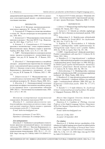 6. Шмелёва Е. С. Лингвокреативность в медийном дискурсе: диахроническая перспектива (на материале англо- и русскоязычной прессы разных типов за 1990- 2022 гг.) // Дискурс и язык в эпоху “больших данных”: Вариативность, креативность, эксперимент: сб. науч. ст. / отв. ред. И. В. Зыкова. М.: Р. Валент, 2023. С. 300314. EDN: UQZVBC