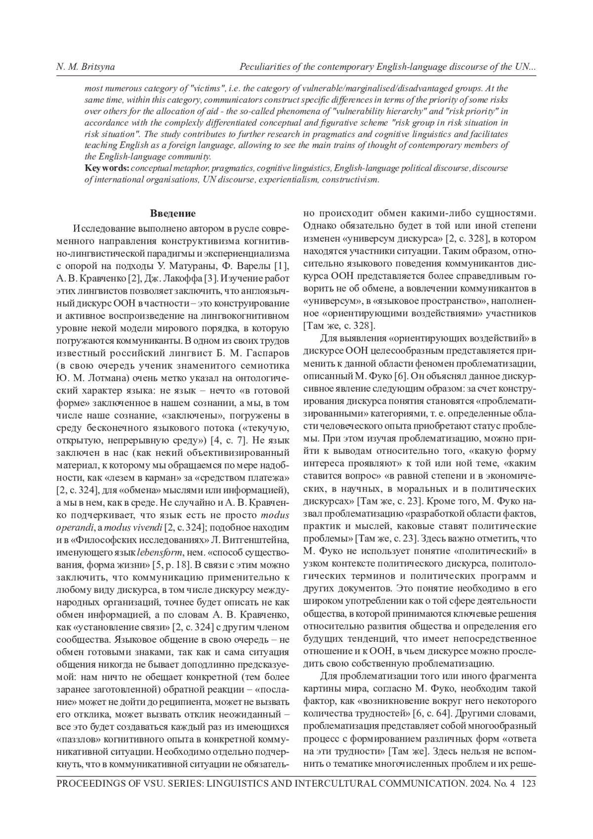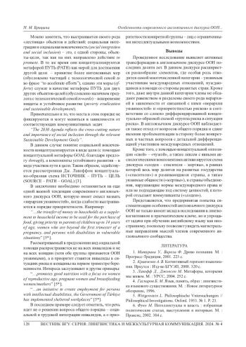 9. Брицына Н М. Англоязычный дискурс ООН: особенности и практическое применение в описании современного миропорядка // Филологические науки в МГИМО. 2022. №. 3. С. 70-81. EDN: RLAKAM