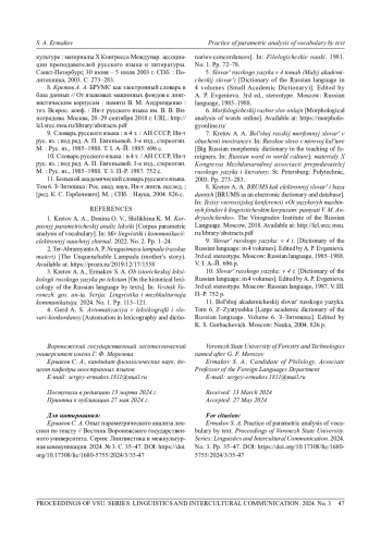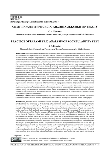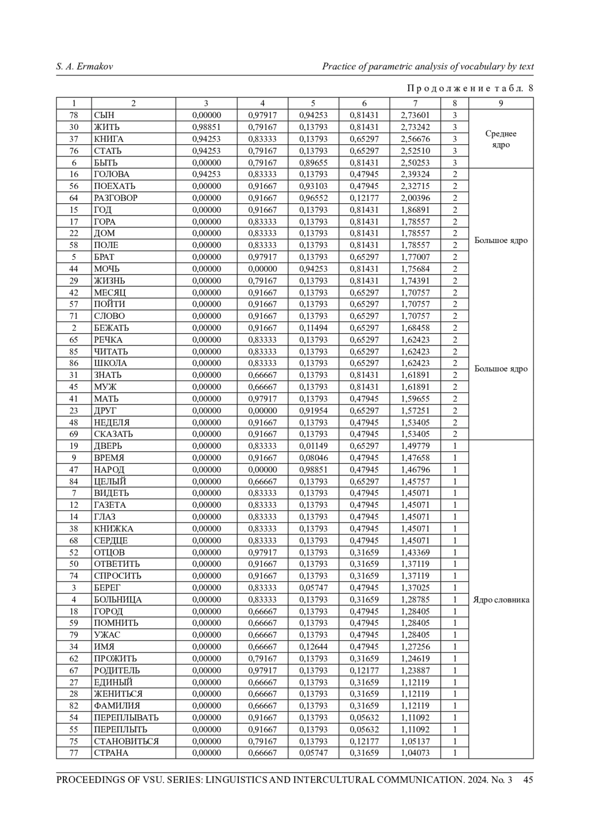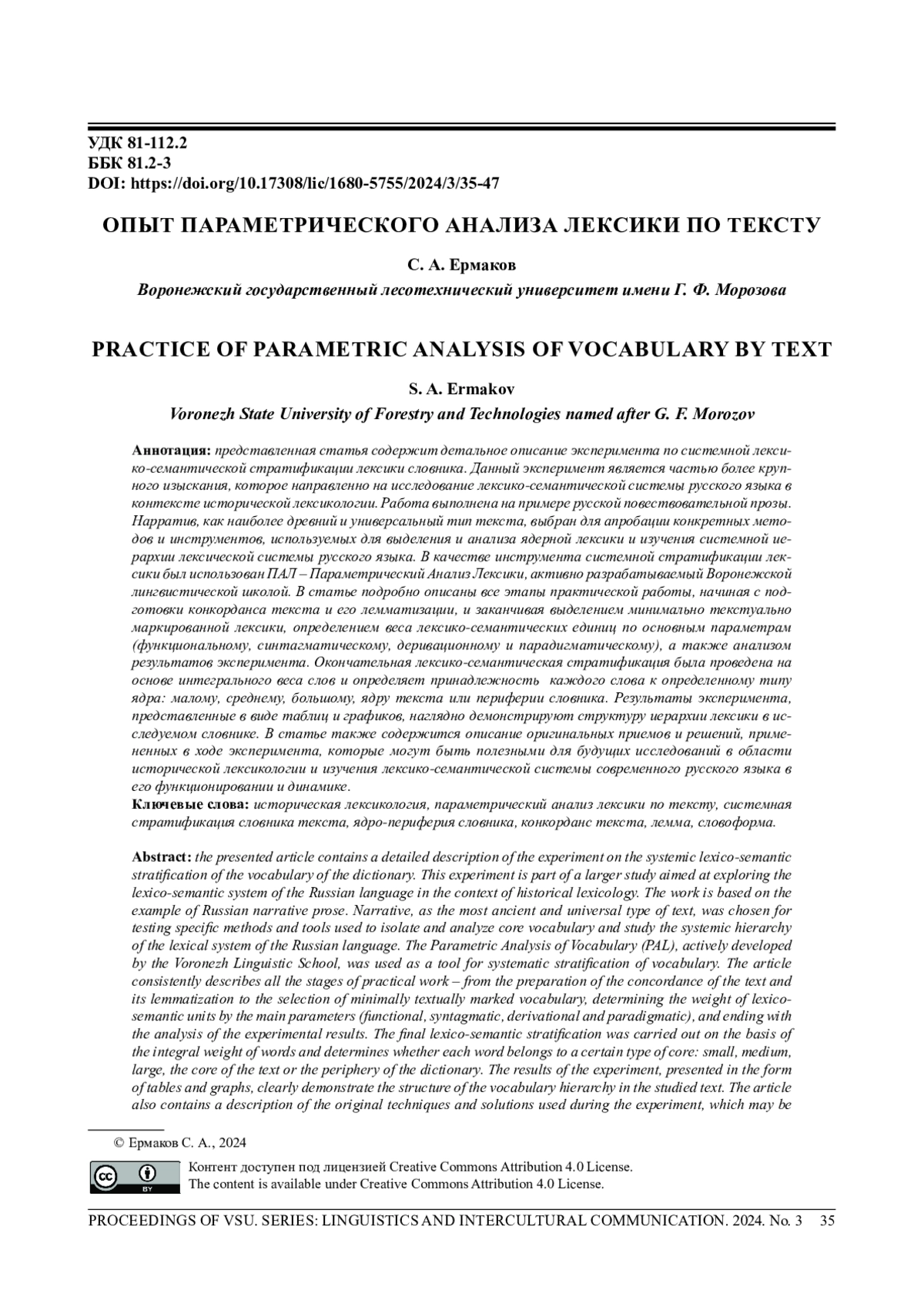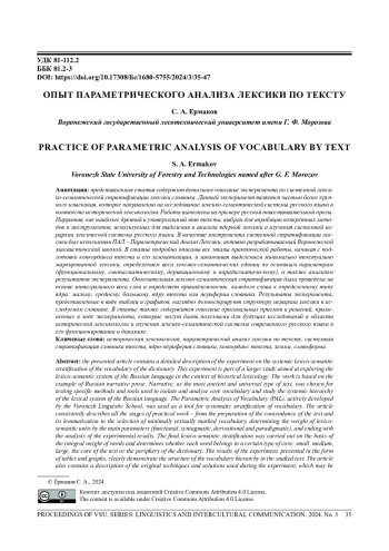 ЕРМАКОВ С. А. ОПЫТ ПАРАМЕТРИЧЕСКОГО АНАЛИЗА ЛЕКСИКИ ПО ТЕКСТУ // ВЕСТНИК ВОРОНЕЖСКОГО ГОСУДАРСТВЕННОГО УНИВЕРСИТЕТА. СЕРИЯ: ЛИНГВИСТИКА И МЕЖКУЛЬТУРНАЯ КОММУНИКАЦИЯ. 2024. № 3