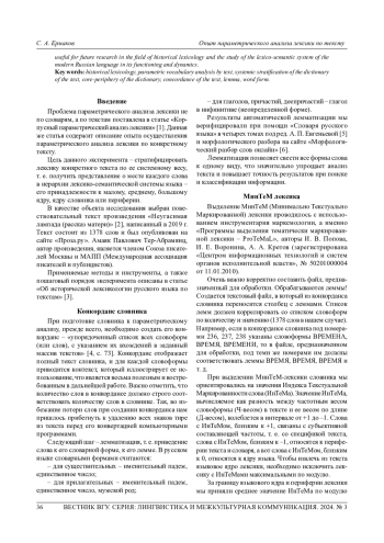 Ключевые фразы: ИСТОРИЧЕСКАЯ ЛЕКСИКОЛОГИЯ, параметрический анализ лексики по тексту, системная стратификация словника текста, ядро-периферия словника, конкорданс текста, лемма, словоформа