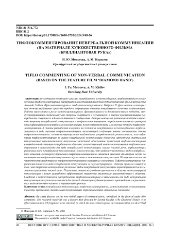 Исследование посвящено анализу невербального аспекта общения, вербализованного в виде звуковых тифлокомментариев. Материалом исследования послужил художественный фильм режиссера Леонида Гайдая «Бриллиантовая рука» с тифлокомментированием. Выбрано 85 фрагментов, в которых при помощи вербальных средств передачи информации описаны невербальные аспекты коммуникации. Работа выдержана в русле междисциплинарного, функционального и деятельностного подходов, предусматривающих системный учет стороны говорящего и слушающего, а также коммуникативные потребности говорящего и данного языкового сообщества. Авторы освещают различные подходы к изучению вопросов невербальной коммуникации и тифлокомментирования, определяют основные критерии классификаций видов невербальной коммуникации, демонстрируют виды и различные методы тифлокомментирования. В статье разработан алгоритм исследования невербального аспекта общения, вербализованного в виде звуковых тифлокомментариев, включающий следующие этапы: составление списка тифлокомментариев с соответствующими им таймкодами, упорядоченный хронологически; классификация тифлокомментариев по видам невербальной коммуникации (кинесика, проксемика, тактильная коммуникация, паралингвистика, визуальные элементы); обоснование применения тифлокомментариев в определенной ситуации невербального общения; количественный анализ использования тифлокомментирования в зависимости от вида невербальной коммуникации; анализ частей речи, вербализующих различные виды невербальной коммуникации. Анализ показал, что наиболее частотным видом невербального общения, к которому применено тифлокомментирование, является кинесика. На втором месте по частотности тифлокомментирования - проксемика и тактильная коммуникация. На третьем месте по частотности представлено тифлокомментирование визуальных элементов. Тифлокоментирование паралингвистического вида невербальной коммуникации не зарегистрировано. Авторы пришли к выводу о том, что тифлокомментирование различных видов невербальной коммуникации характеризуется использованием различных частей речи. Полученные знания могут быть применены в области межкультурной коммуникации с целью разработки эффективной стратегии грамотного взаимодействия и общения. Сведения о количественном распределении тифлокомментариев в зависимости от вида невербальной коммуникации могут использоваться для лучшей адаптации аудиовизуального произведения к перцептивным возможностям человека с нарушенным зрением.