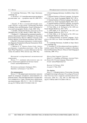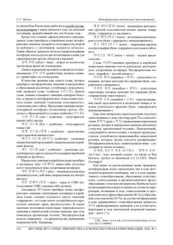 Словарный состав современного корейского языка (южнокорейский вариант) активно пополняется англицизмами в условиях интенсивного языкового контакта. Как правило, в процессе заимствования происходит семантическое сужение, а затем в процессе усвоения и адаптации англицизма в корейском языке и культуре происходит расширение его семантического значения, в том числе за счет механизмов метафоризации. Новые слова и концепты из английского языка подвергаются переосмыслению в рамках концептуальной системы и метафорического мышления корейского народа. Материалом исследования послужил корпус из 387разноструктурных метафорических единиц, полученных методом сплошной выборки из толковых словарей корейского языка, сборников неологизмов корейского языка за шесть лет с 2017 по 2022 г., а также сайтов южнокорейских газет. Для описания и анализа отобранного языкового материала был применен семантико-когнитивный метод с целью выявления разных типов метафорических номинаций и моделей через анализ семантики языковых единиц. В рамках анализа языкового материала были выявлены артефактная, природоморфная, социоморфная, антропоморфная и пространственная метафоры; полные и частичные метафоры. Областью-источником являются привычные бытовые сферы, а метафорическая экспансия происходит в сферы, которые имеют большое значение в современном корейском обществе с точки зрения носителей корейского языка. Были выявлены следующие виды метафоризации в корпусе: метафоризация в ходе автономной вторичной номинации, метафоризация в ходе деривативного словообразования и образования слов-портмоне, словосложения и двухкомпонентного фразообразования с участием англицизмов. Были выявлены следующие виды метафоризации в корпусе: метафоризация в ходе автономной вторичной номинации, метафоризация в ходе деривативного словообразования, образования слов-портмоне, словосложения и двухкомпонентного фразообразования с участием англицизмов. Наиболее часто встречающимися в корпусе являются примеры метафоризации, возникающей в ходе словосложения и двухкомпонентного фразообразования (46 %), а таже в словах-портмоне (38 %).