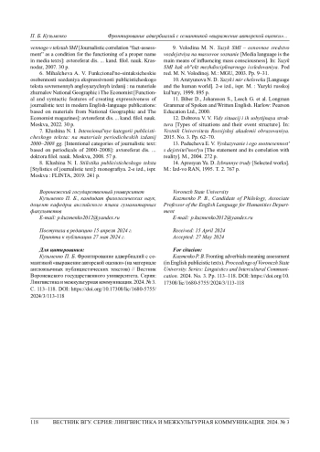 6. Михалчева А. В. Функционально-синтаксические особенности создания экспрессивности публицистического текста современных англоязычных изданий: на материале журналов National Geographic и The Economist: автореф. дис.. канд. филол. наук. М., 2022. 30 с. EDN: AEOVXY