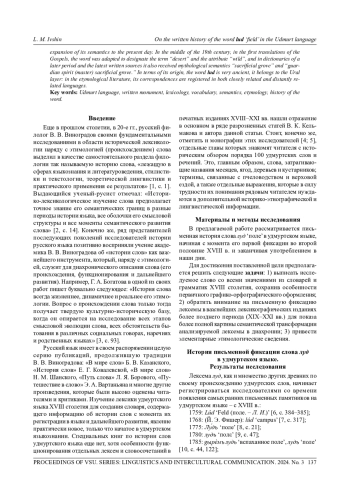В предлагаемой работе рассматривается письменная история слова луд ‘поле’ в удмуртском языке, начиная с момента его первой фиксации во второй половине XVIII в. и заканчивая употреблением в наши дни. Для достижения поставленной цели предполагается решить следующие задачи: 1) выписать исследуемое слово со всеми значениями из словарей и грамматик XVIII столетия, сохранив особенности первичного графико-орфографического оформления; 2) обратить внимание на письменную фиксацию лексемы в важнейших лексикографических изданиях более позднего периода (XIX–XXI вв.) для показа более полной картины семантической трансформации анализируемой лексемы в диахронии; 3) привести элементарные этимологические сведения.