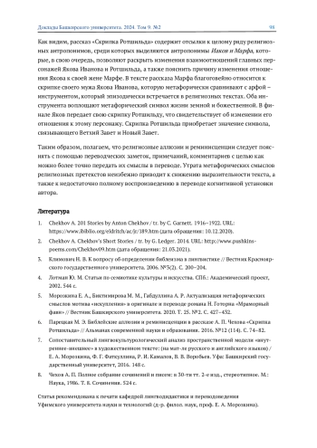 Статья посвящена проблеме воссоздания в художественном переводе библейских претекстов. Актуальность темы определяется необходимостью исследования англоязычных переводов рассказов А. П. Чехова в аспекте рассмотрения интертекстуальных вкраплений из библейских претекстов с целью изучения актуализации их метафорических смыслов в процессе перевода. Научная новизна статьи определяется тем, что в ней предпринята попытка анализа в сравнительно-сопоставительном аспекте содержащих библейские претексты языковых единиц, представленных в оригинале рассказа А. П. Чехова «Скрипка Ротшильда» (1894), а также их соответствий, фигурирующих в вариантах перевода рассказа на английский язык, осуществленных британскими переводчиками К. Гарнетт (“Rothschild’s Fiddle”, 1920) и Дж. Леджером (“Rothschild’s Violin”, 2014). Выявлено, что для передачи в переводе смыслов подобных интер- текстуальных включений художественного текста в ряде случаев необходимо использование переводческого комментария, либо переводческих примечаний.