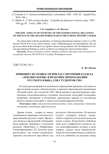 В статье рассматриваются особенности применения принципа системности при изучении раздела «Лексикология» в практике преподавания дисциплины «Русский язык» для студентов СПО. Представлена и аргументирована определенная последовательность изучения лексических категорий (полисемии, омонимии, синонимии и антонимии), предложены приемы по системному анализу данных категорий, а также по изучению фразеологизмов.