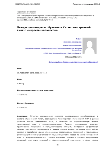 Объектом исследования являются инновационные преобразования в системе образования Китая, реализуемые Министерством образования КНР в рамках развития новых гуманитарных наук, с акцентом на образовательную модель «иностранный язык + микроспециальность». Предмет исследования включает практические механизмы и методологические принципы построения эффективной системы подготовки специалистов в рамках данной модели. Основная цель работы состоит в разработке научно обоснованных теоретических положений и практических рекомендаций по совершенствованию модели подготовки кадров по схеме «иностранный язык + микроспециальность». Особое внимание уделяется анализу современных тенденций интеграции языковой и профессиональной подготовки, а также поиску оптимальных способов сочетания этих компонентов в образовательном процессе для повышения его эффективности и соответствия требованиям современного рынка труда. В ходе исследования были использованы традиционные общенаучные методы познания, включая анализ, синтез, аналогию и обобщение теоретических и практических аспектов изучаемой модели. Результаты исследования выявили конкретные примеры успешной интеграции русского языка и узкоспециальных дисциплин в образовательных программах китайских вузов, а также определили ключевые принципы построения эффективной модели подготовки междисциплинарных специалистов. Научная новизна работы заключается в том, что впервые проводится комплексный анализ этой инновационной образовательной тенденции в Китае, рассматриваются её методологические основы и практические реализации. В статье систематизированы современные подходы к междисциплинарному обучению, что способствует более глубокому пониманию данной модели. Особую ценность представляет обобщение новейших достижений в области сочетания языковой и профессиональной подготовки. Полученные результаты создают теоретическую базу для дальнейших исследований и могут быть применены при разработке образовательных программ нового поколения, что подчеркивает практическую значимость проведенного анализа.