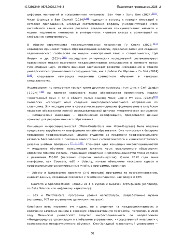18. Цуй Яньцян, Линь Сяои, Дуань Юй. Исследование практической модели подготовки междисциплинарных специалистов в контексте новых гуманитарных наук // Журнал Сучжоуского университета (Образовательные науки). 2024. Т. 12, № 1. С. 58-67. (崔延强, 林笑夷, 段禹. 新文科背景下复合型人才培养实践模式研究[J]. 苏州大学学报(教育科学版)). 2024. № 12(1). С. 58-67.