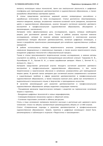 2. Ван Ц. Педагогика цифровых искусств и технологии цифровизации художественного образования в вузах Китая // Мир науки. Педагогика и психология. 2024. Т. 12, № 4. URL: https://mir-nauki.com/PDF/43PDMN424.pdf.