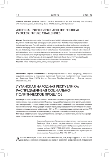 В статье предприняты попытки проанализировать потенциал воздействия искусственного интеллекта на политический процесс, раскрыть проблематику синтеза цифровых технологий, современных достижений в сфере искусственного интеллекта на политические институты и процессы. В статье раскрывается амбивалентность понимания искусственного интеллекта, представлены основные направления управления искусственным интеллектом в контексте политического процесса, обобщаются функции управления рисками внедрения искусственного интеллекта в политический процесс. В статье констатируется неизбежность влияния разрабатываемых опережающими темпами технологий искусственного интеллекта на общество, процесс политического участия, институты гражданского общества. В статье на примере зарубежного опыта выявлются риски имплементации искусственного интеллекта в социально-политические процессы, определяются возможные направления развития ИИ для включения в публичную сферу и политический процесс, влияния ИИ на процесс демократизации общества.