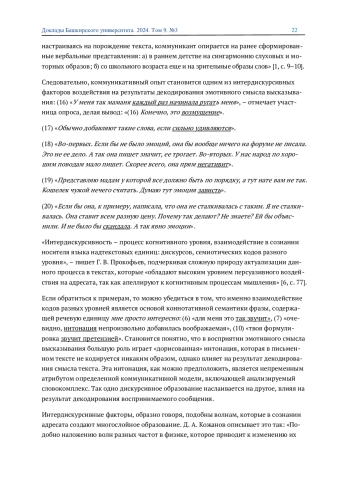 Процесс и результат декодирования эмотивного элемента смыслового содержания высказывания представляет интерес как с позиций эмотивологии (В. И. Шаховский, Л. Г. Бабенко, В. И. Жельвис, Е. Ю. Мягкова, Э. Л. Носенко, Д. А. Романов и др.), в центре внимания которой находятся процессы объективации эмоционально-оценочной сферы, так и с позиции дискурсивной лингвистики (Т. ван Дейк, В. И. Карасик, Н. Ф. Алефиренко и др.), рассматривающей речь как пространство реализации смыслов. В оси координат когнитивной лингвистики важно исследование коннотативнопрагматического потенциала единиц живой речи.