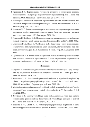 2. Кравцова Л. А. Формирование готовности студентов к организации воспитательной работы : на примере педагогического вуза : автореф. дис. ... канд. пед. наук : 13.00.08. Махачкала : Дагест. гос. пед. ун-т, 2007. 18 с.