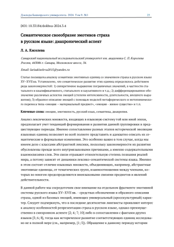 Статья посвящена анализу семантики эмотивных единиц со значением страха в русском языке XV-XVII вв. Установлено, что семантическое развитие этих единиц определялось действием ряда закономерностей: 1) синкретичное выражение пограничных значений, в частности статального и квалификативного, статального и каузативного и т. д.; 2) дифференцированное обозначение различных аспектов эмоций (степени интенсивности, длительности, внешнего выражения); 3) образное описание эмоций с помощью моделей метафорического и метонимического переноса типа «эмоция - материальный предмет», «эмоция - живое существо» и т. п.