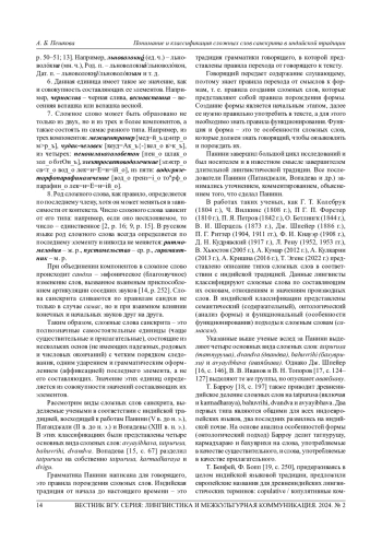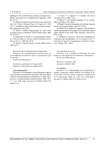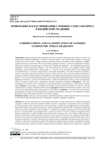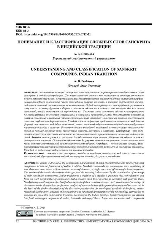 ПЕШКОВА А.Б. ПОНИМАНИЕ И КЛАССИФИКАЦИЯ СЛОЖНЫХ СЛОВ САНСКРИТА В ИНДИЙСКОЙ ТРАДИЦИИ // ВЕСТНИК ВОРОНЕЖСКОГО ГОСУДАРСТВЕННОГО УНИВЕРСИТЕТА. СЕРИЯ: ЛИНГВИСТИКА И МЕЖКУЛЬТУРНАЯ КОММУНИКАЦИЯ. 2024. № 2