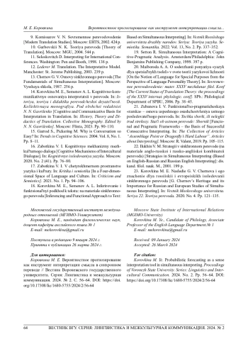 23. Коровкина М. Е. Наследие Г. В. Чернова и его значение для российских и европейских исследований синхронного перевода // Вестник Моск. ун-та. Сер. 22. Теория перевода. 2020. № 4. С. 121-135. EDN: JDEXLY