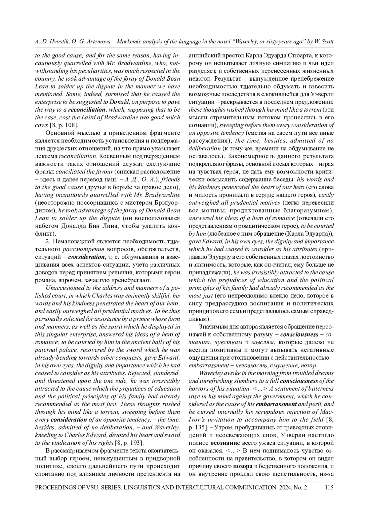 Цель данной статьи - формализованный содержательный анализ языка исторического романа «Уэверли» (1814) сэра Вальтера Скотта (1771-1832). Описанное исследование выполнено в русле маркемологии - лингвистического направления, предлагающего выделить в массиве текстов маркемы, особый вид ключевых слов на основе объективного показателя информативности лексемы -Индекса Текстуальной Маркированности (ИнТеМ). Проведенный маркемный анализ языка романа позволил выявить доминантную и вице-доминантную маркемы: disappointment ‘разочарование ’ и consideration ‘размышление ’ соответственно. В результате стратификации маркем установлены маркемное ядро в количестве 15 маркем и маркемная периферия - 35 маркем. Выявлены 10 групп равновесных, а следовательно, равнозначных маркем. В результате семантической классификации маркемы романа «Уэверли» распределены в семь семантических блоков: фундаментальные маркемы, межличностные маркемы, ментально-перцептивные маркемы, эмоциональные маркемы, качественные маркемы, социальные маркемы, морально-этические маркемы. Установлены три ключевых семантических блока: ментально-перцептивные маркемы, эмоциональные маркемы, маркемы, выражающие межличностные отношения. Среди ядерных маркем большинство принадлежит маркемам, описывающим ментально-перцептивные процессы. Маркемный анализ языка романа показывает, что автор придает особенное значение различным аспектам межличностного общения и взаимодействия, способности прийти к договоренности и примирению. Важной представляется необходимость глубокого размышления, рассмотрения всех аспектов ситуации, чем герои романа зачастую пренебрегают. Особо значимым для автора является обращение персонажей к собственному рассудку и сознанию как источнику мыслительной деятельности. В романе главенствуют негативные эмоции - разочарование и чувство стыда, смущения. Кроме того, акцент делается на необходимости осмысления поступков, комплексной рефлексии и, как следствие, исправлении ошибок.