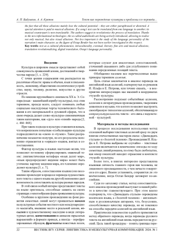 Статья посвящена анализу художественного текста как культурного явления, а также восприятию этого текста в координатах «чужой» культуры. Авторы обращаются к переводам на английский язык текстовых аллюзий в романах И. Ильфа и Е. Петрова «Двенадцать стульев» и «Золотой теленок», понимая под словом «аллюзия» мысленную отсылку читателя к культурным событиям реальной жизни, произведениям литературы и искусства, включая в рамки последнего и музыку. В результате объектом разбора становятся аллюзии четырех типов: событийные, литературные, художественноизобразительные и музыкальные. Перевод аллюзий на английский язык (и часто практикуемый обратный перевод) свидетельствует о том, что все эти отсылки в основном утрачивают свой культурный потенциал, подвергаясь перефразировке или искажению. Особое внимание в работе уделяется музыкальным аллюзиям. Если текст песни можно перевести с одного языка на другой, то в традиционном бумажном формате его музыкальное сопровождение оказывается непереводимым. Авторы предлагают революционизировать формат перевода. Благодаря информационным технологиям сегодня активизируются электронные и аудиокниги, в которых вполне реально использовать не только музыкальные аллюзии, но и визуальные. Интерес представляет обращение к языковой личности главного героя повествования, так как ранее фигура Остапа Бендера с этих позиций не изучалась.